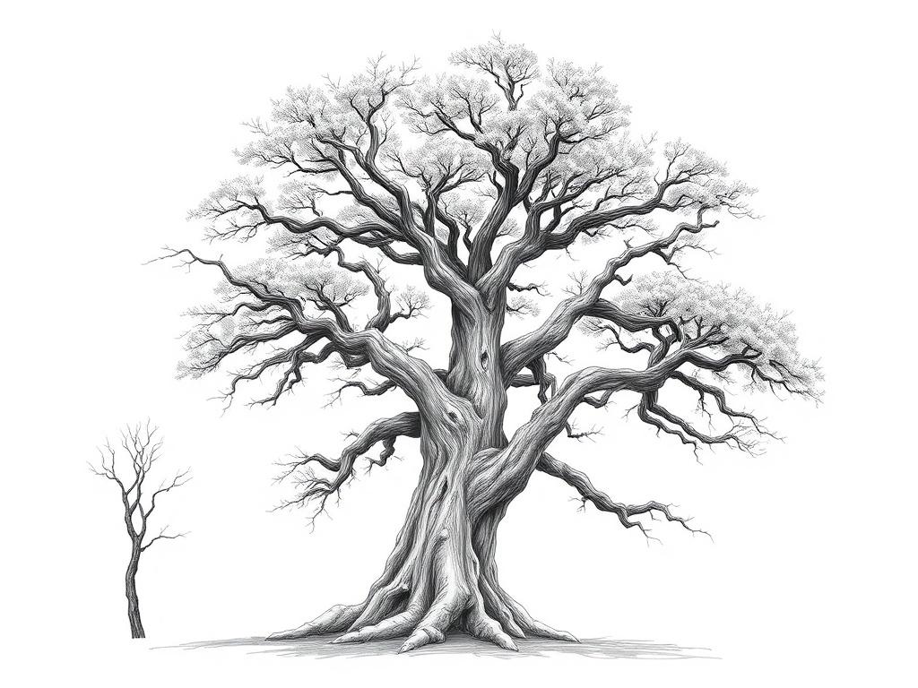 - Плотность и ритм штриха: частые темные штрихи на коре передают старость и прочность, редкие — живость и молчаливую стойкость.