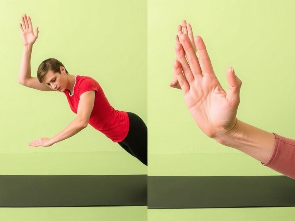 Ладони лежат на поверхности, пальцы слегка согнуты; запястья выравниваются по одной линии с предплечьями. Медленно возвращайте кисти в нейтральную позицию после каждого движения. Выполните 10–12 повторов, затем отдохните 20 секунд.